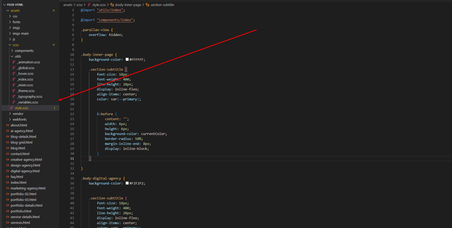 Just make sure all of the css was compiled from scss, so if you want to edit any css, we recomend to use Scss and compile SCSS files. for better understanding check out the screenschort